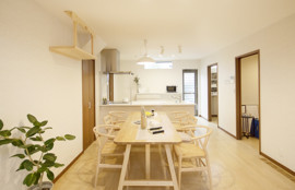 無駄な広さが無く、とても使いやすい建物です。素材も無垢材などを使っているので手触りや足触りも良く、あたたかい感じがとっても気に入っています。吹抜になったリビングの天井はとっても開放感があるのになんとなく落ち着く場所で家族みんな気に入っています。